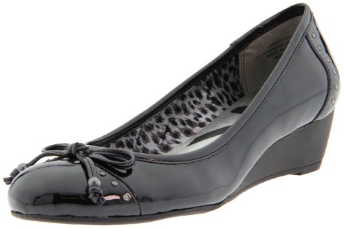 Women's Anne Klein, Shevanie 3 patent low wedge pumps A sweet dress pump style with low, 1 1/2 inch heel and classy bow accent Studded details at the toe and heel Smooth linings and cushioned insole for all day comfort Durable traction pattern rubber outsole