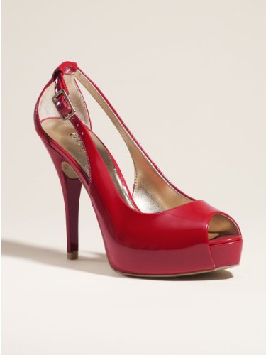 Fall head over heels for these sexy and timeless peep-toe pumps. ? Peep-toe. Platform sandal. Stiletto heel. ? Cut-out sides. Adjustable ankle strap. ? 4" high heel ? 1" platform ? Material: Patent Leather, Faux-Leather Women's Shoes > Dress
