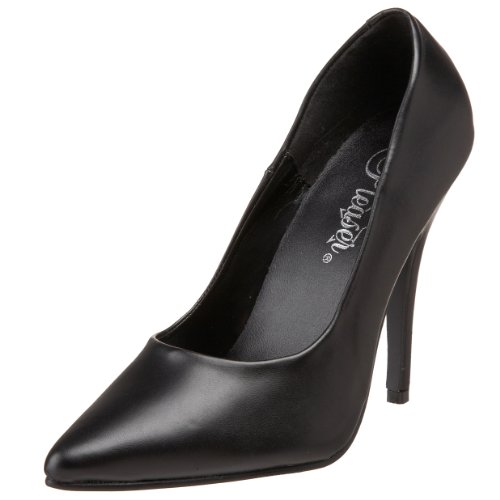 As the ultimate go-to name in sexy shoes, Pleaser has become the standard all others are judged by. Attention to detail, superb craftsmanship, fine materials and innovative designs contribute to Pleaser's reputation among sexy shoe aficionados and professional perfomers alike. Synonymous with sex appeal, Pleaser shoes have graced the covers and editorials of countless fashion magazines and are featured in numberous Hollywood movies and television shows. The classic Seduce-420 pump features a 5" heel with black faux leather uppers. Sizes are in Womens. To convert to Mens, go down two sizes. For example, a Womens size 12 is equivalent to a Mens size 10.